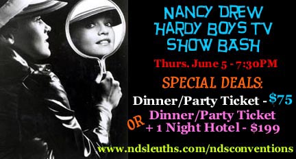 If you want to purchase a ticket to just attend the Nancy Drew & Hardy Boys 70s TV Bash on Thursday, June 5 at 7:30pm--they are $75.00 per person and that includes meeting our special guests at the party, a special booklet, and dinner.